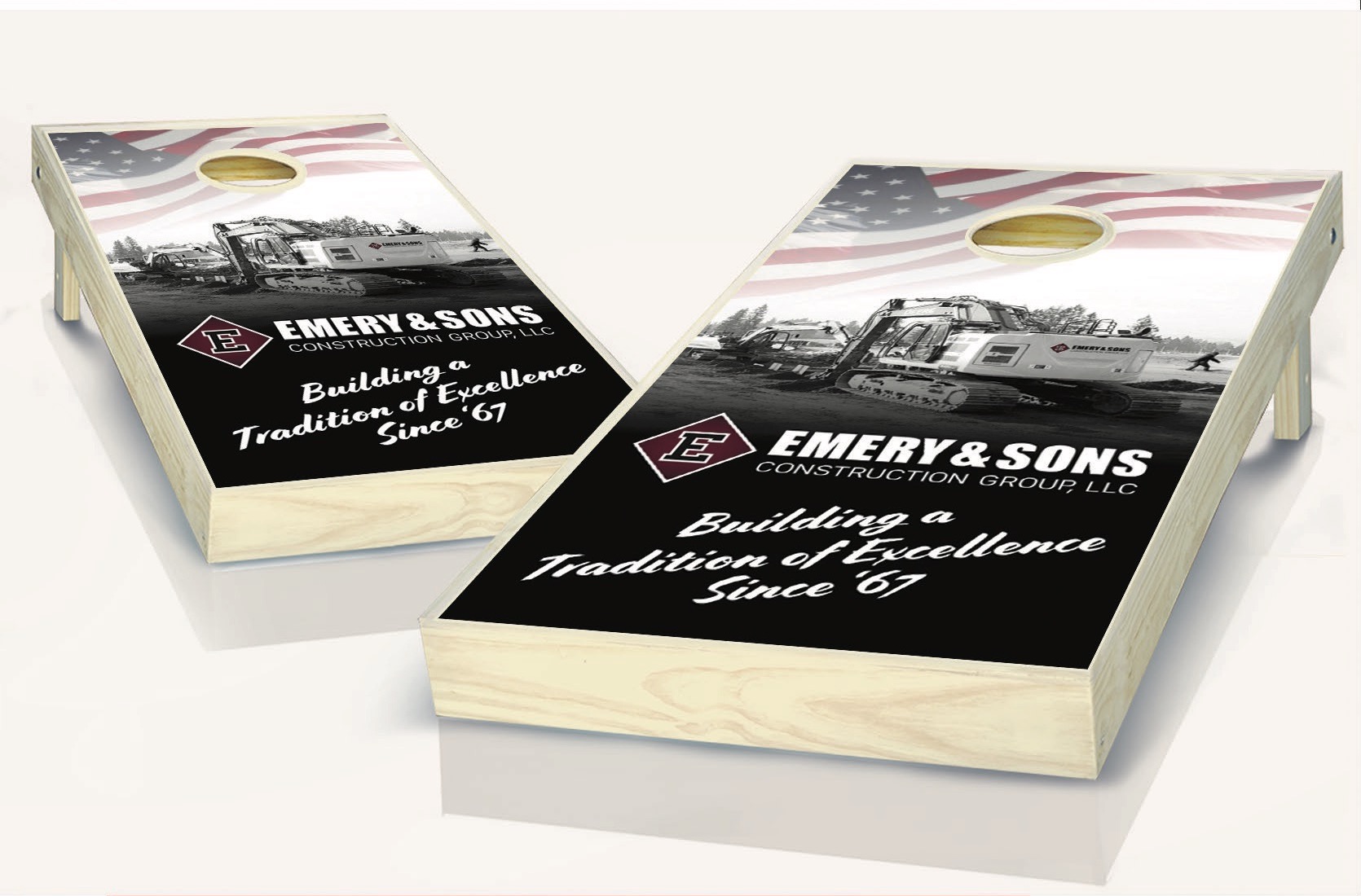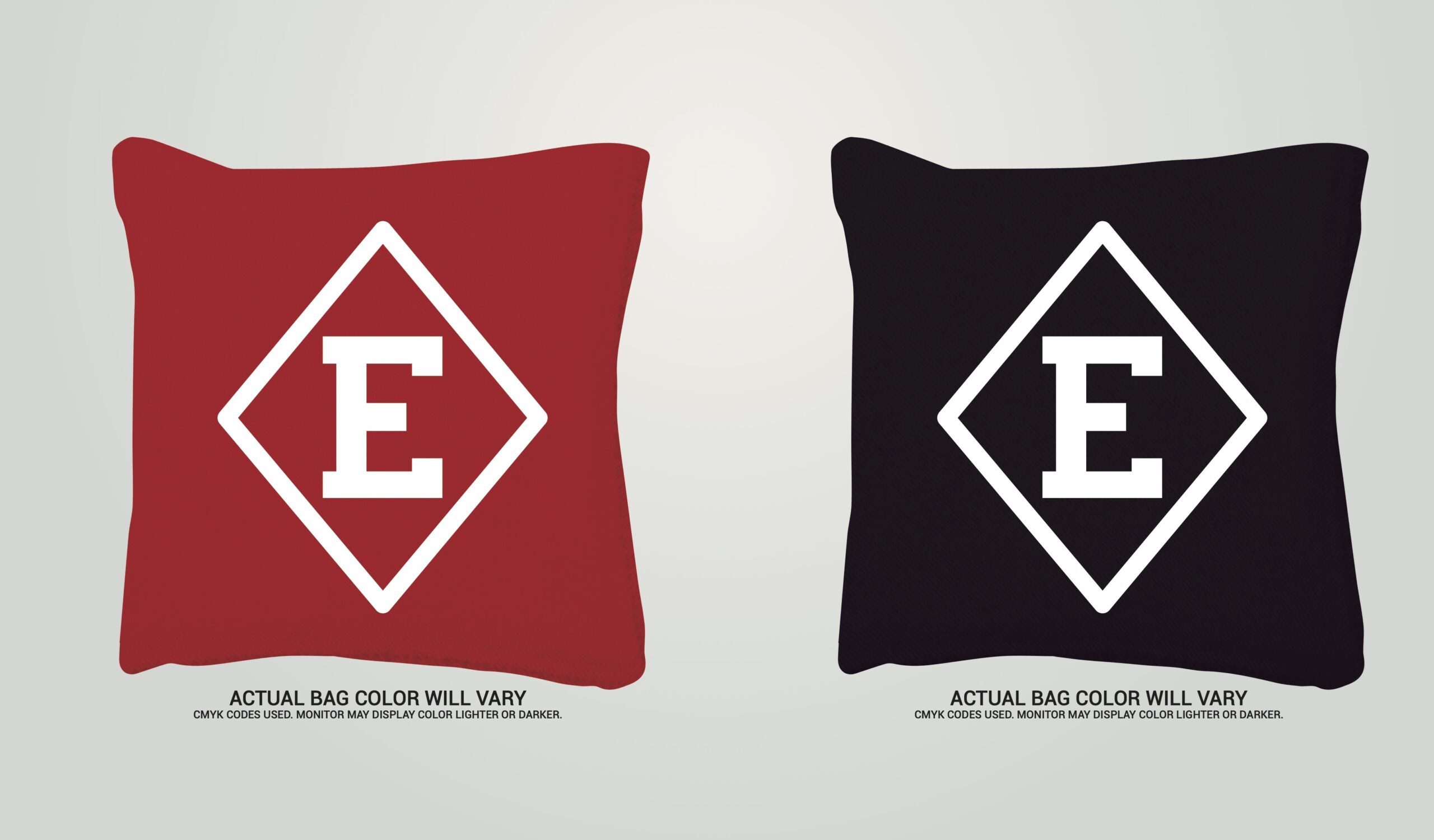 Our Regulation Cornhole Set includes two scoring platforms and 2 sets of 4 throwing bags. The entire 2ft by 4ft landing surface of the scoring platform can be fully imprinted. The platforms are all wood, the landing surface is 1/2in plywood which sits on a frame constructed of 1in by 3in poplar wood. The platforms are available in natural wood. We apply the logo with your choice of adhesive vinyl or UV direct print, and then protect the logo with a coat of polyurethane. The throwing bags are 6in by 6in duck cloth and filled with 14-16oz of whole corn. Synthetic filler is also available for an additional charge. The standard set includes blank bags available in 17 colors, and can be imprinted for an additional charge.